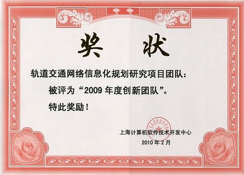 由上海市软件评测重点实验室协同上海软件中心软件平台服务部承担的”轨道交通网络信息化规划研究项目“团队获得2009年度上海软件中心创新团队。该项目团队的优秀工作进一步拓展了上海市软件评测重点实验室在轨道交通行业领域的先导作用和示范作用,促进了上海市软件评测重点实验室面向软件产业及客户信息化建设提供系统化服务的能力提升。
