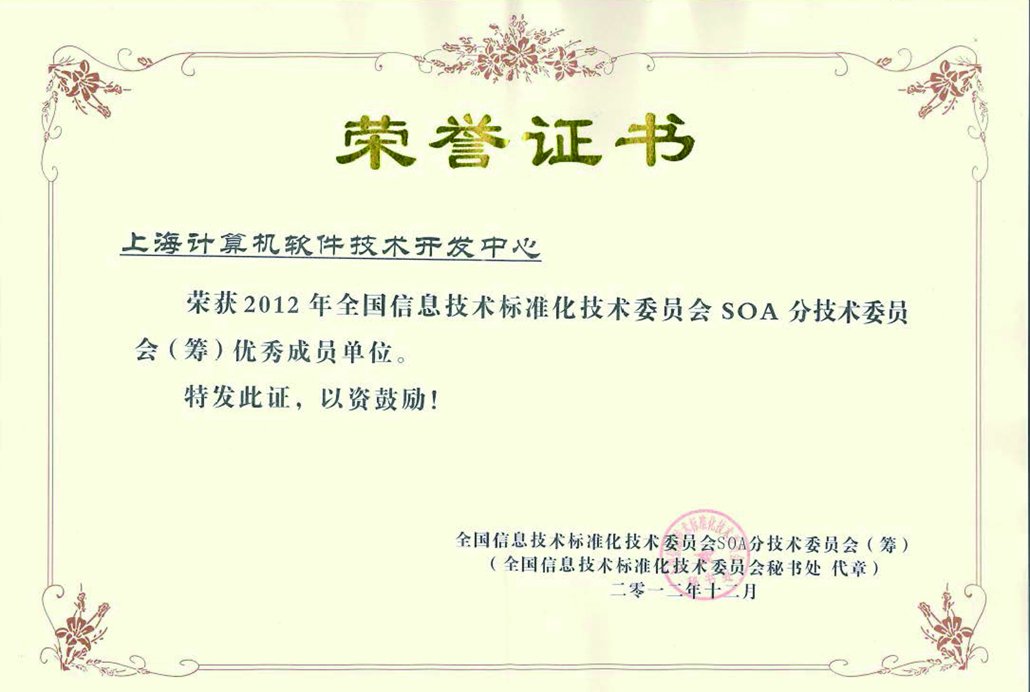 2012年12月全国信息技术标准化技术委员会SOA分技术委员会(筹)2012年第二次全会在北京召开。会议上,工信部软件服务业司、中国电子技术标准化研究所、国际组织及国际专家代表、中国SOA相关企业代表及行业协会代表等参加了本次会议,并对此前SOA标准工作组为SOA国家标准制定、国际标准化等方面的工作进行了总结。SOA标准化工作组通过对成员单位的工作情况(包括参加国内会议次数、参与国际标准化工作、标准参与编写情况及协办应用推广活动四个方面)进行汇总,据此评选出优秀成员单位及先进个人。上海计算机软件技术开发中心被评为2012年全国SOA优秀成员单位,软件中心副主任、评测重点实验室主任蔡立志被评为2012年全国SOA分委会(筹)卓越成就奖。奖项的获得,是全国SOA分委会(筹)对评测重点实验室积极参与国家SOA工作的肯定。